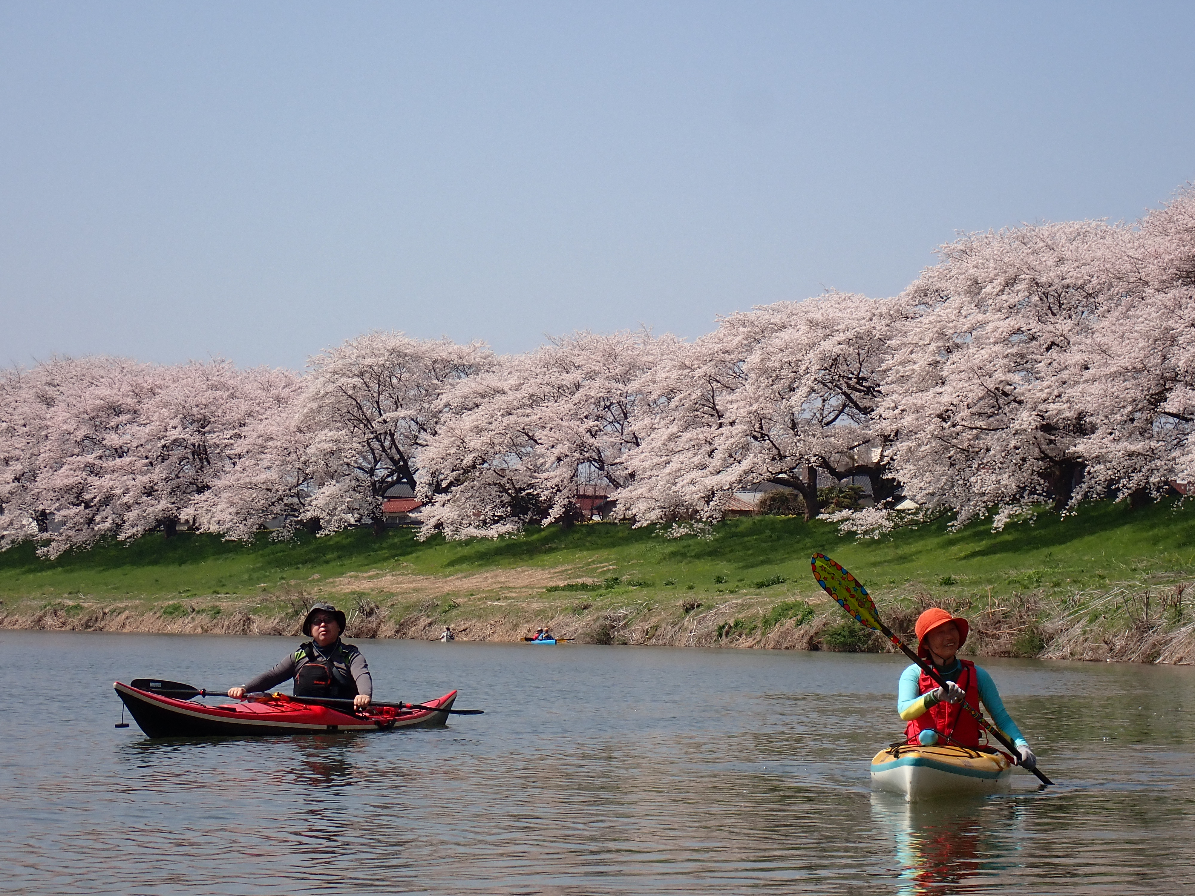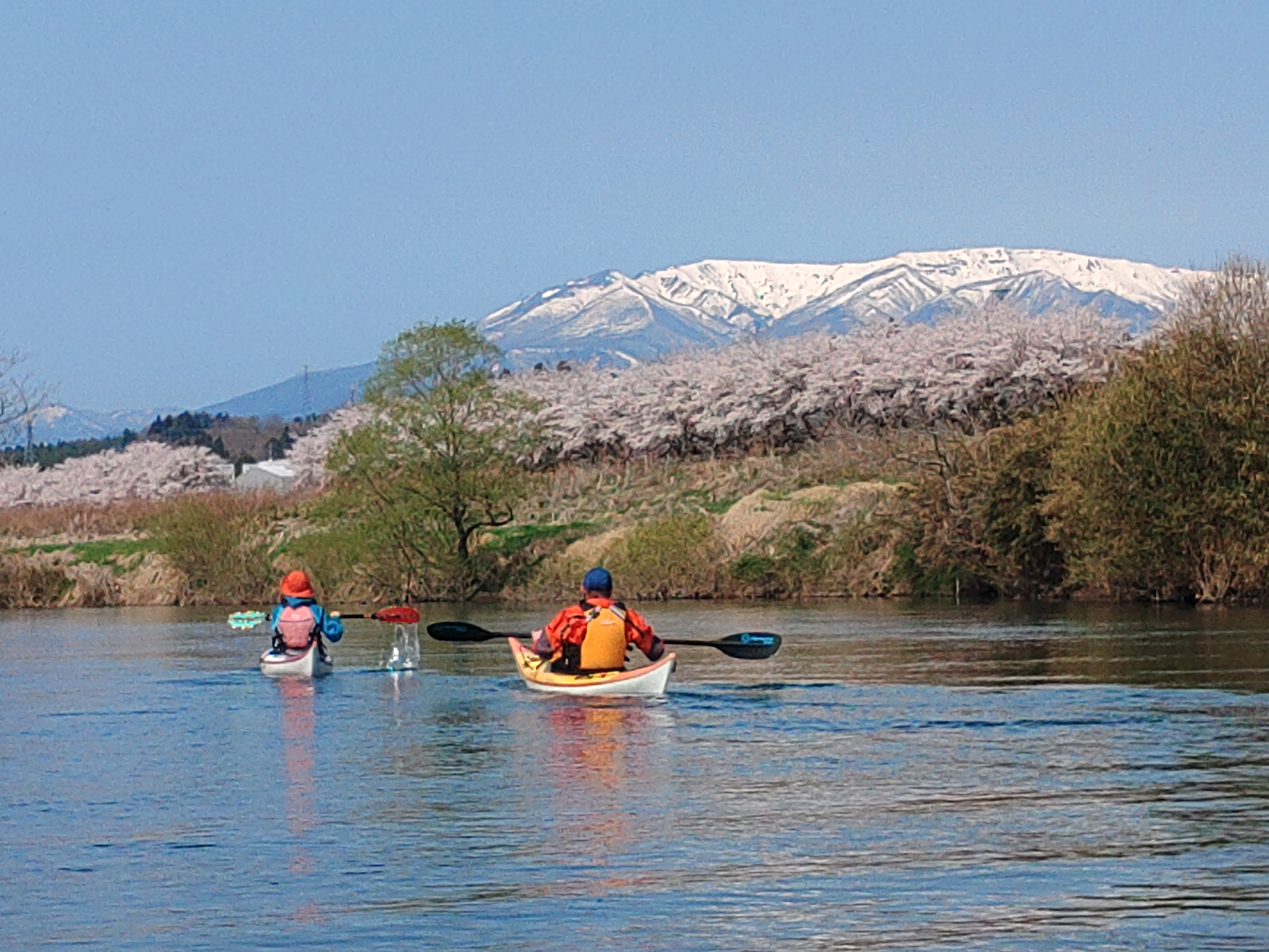桜の花が散るまで随時開催いたします。一目千本桜を、川のうえからのんびり眺めます。川面に映る桜と蔵王の頂き。