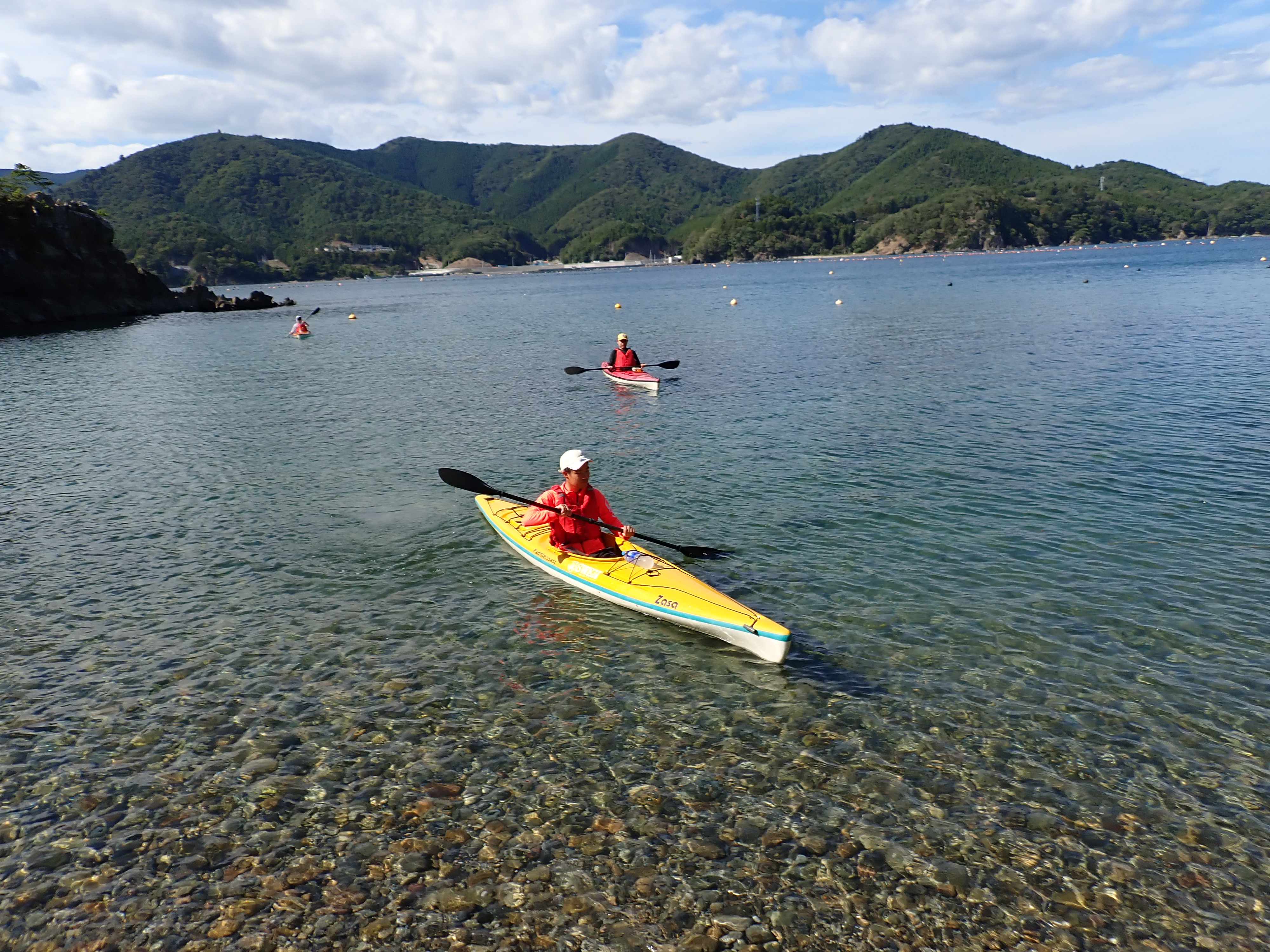 初めての方にも安心の安定性と、漕ぎやすさ、漕ぎの軽さがマッチしている、スクール専用カヤックと軽いカーボンパドル
