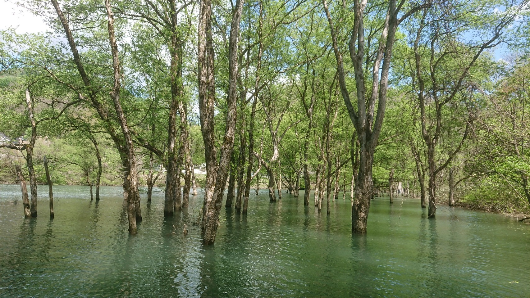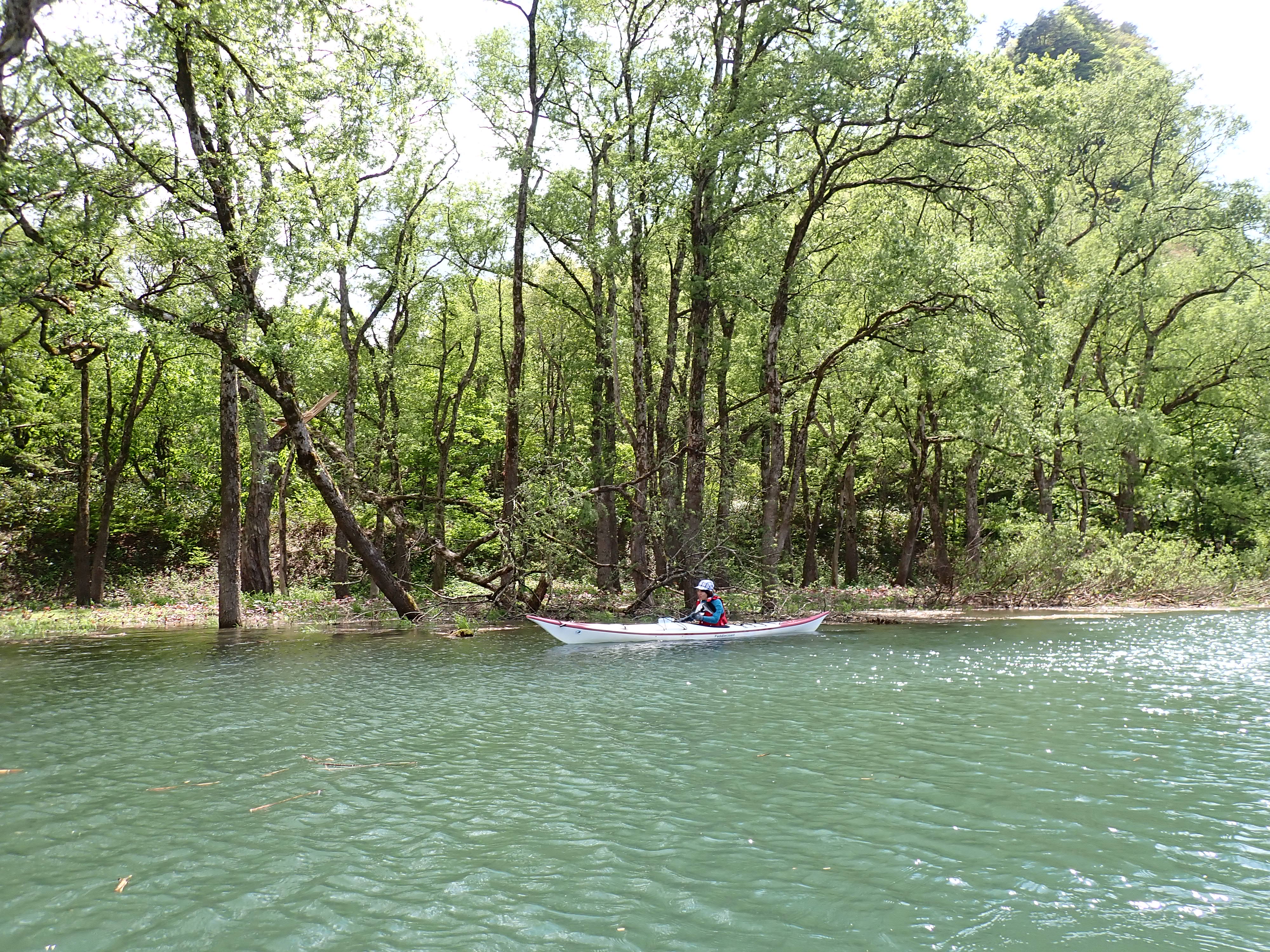 水没林。ダム湖に特有の春(満水時)の景色です。雪解け水で増水したダム湖では、通常時に森林になっているエリアにも水が入り、湖の中から大きな木が生えていて、直ぐそばまでカヤックで近づける、不思議な世界が現れます。